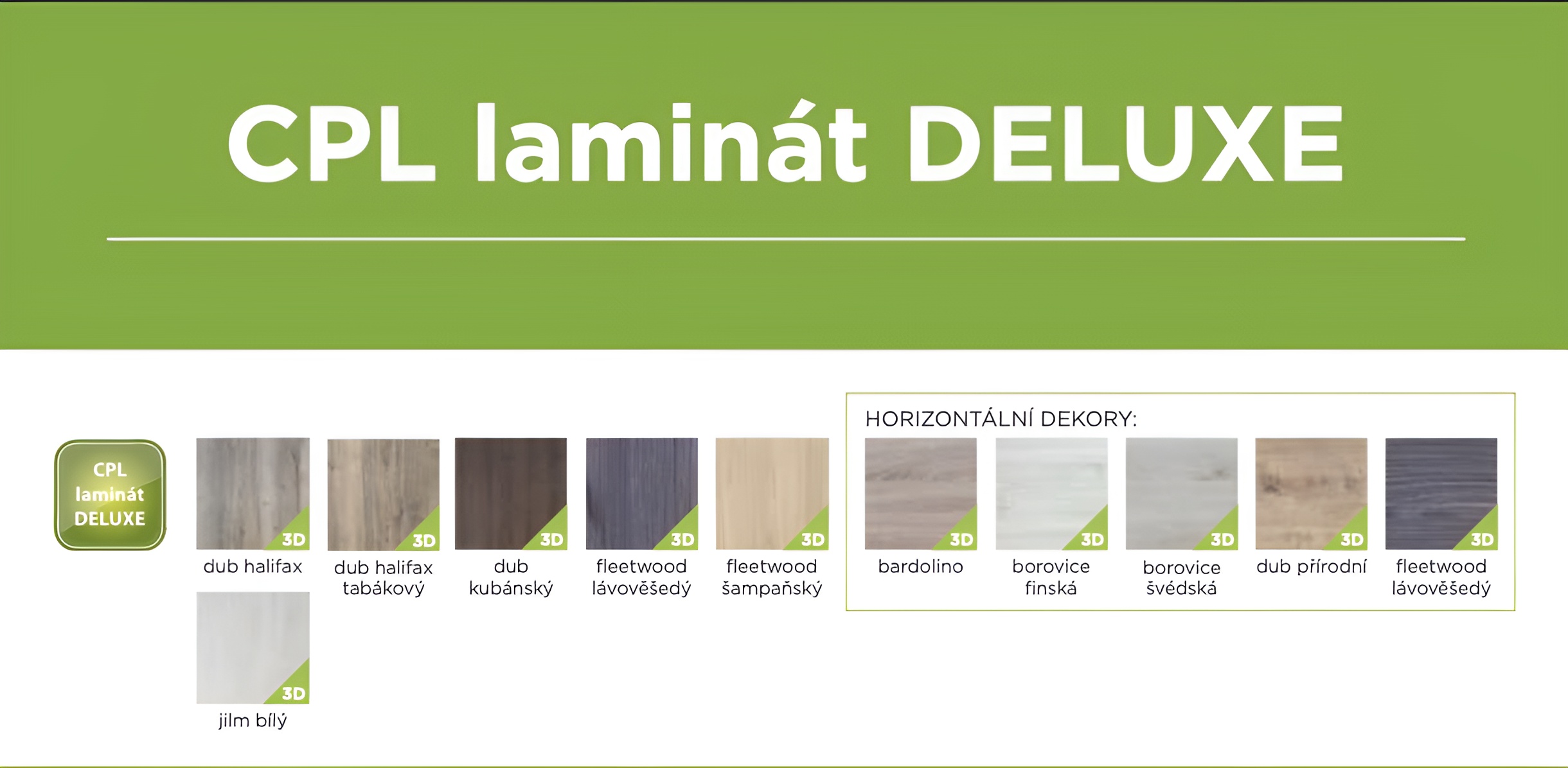 Bílá stnadard CPL standarrd.jpg  Buk CPL standard.jpg Ořech CPL standard.jpg Olše CPL standard.jpg Dub cobridge CPL standard.jpg
